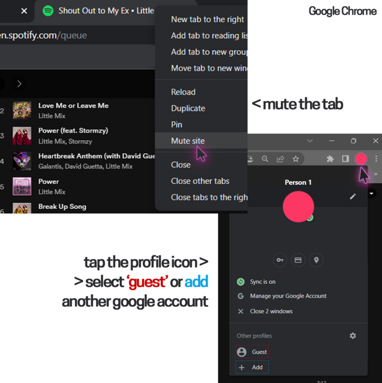 3. Connect to Spotify using a different account for each tab (+ download Spotify app).