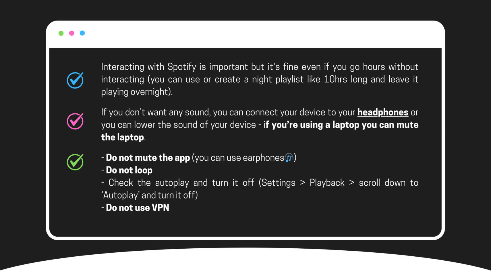 First of all, interacting with Spotify is important but it's fine even if you go hours without interacting (you can use or create a night playlist 7/8hours long and leave it playing overnight), just check if it’s still playing.