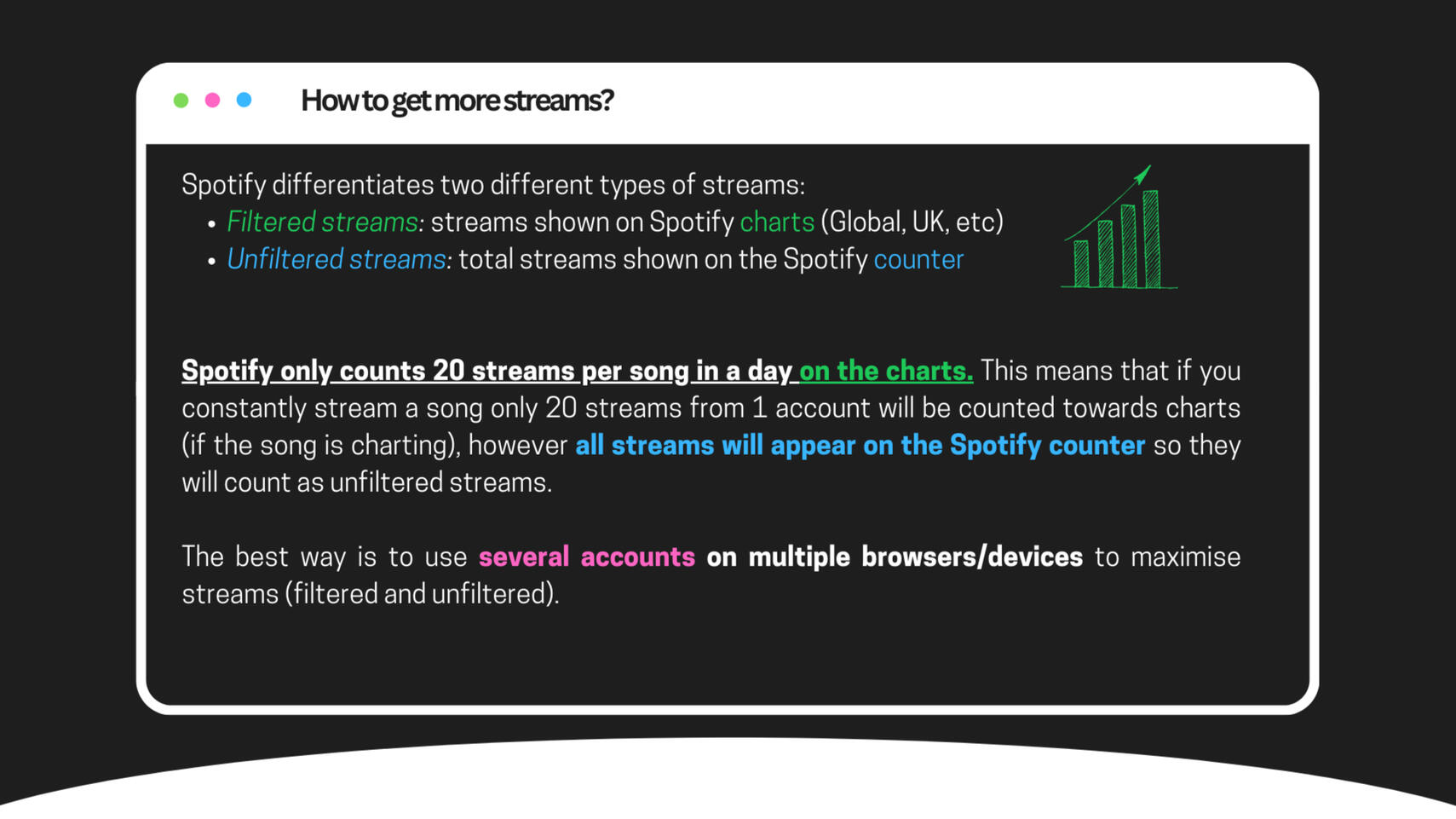 Unfiltered streams = total streams shown on the Spotify counterSpotify only counts 20 streams per song in a day on the charts = if you constantly stream a song (i.e. a new release) only 20 streams from 1 account will be counted towards charts, the rest of them will appear on the Spotify counter (=unfiltered streams)So it’s better to use multiple Spotify accounts to reduce the filtering rate and increase streaming numbers. You will need a pc to stream from several accounts at the same time, alternatively use the app from your mobile phone by logging in/logout from different accounts.