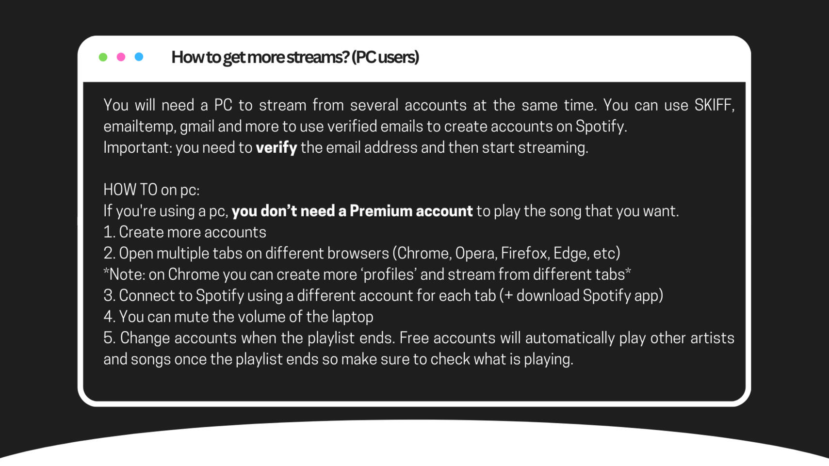 Use several accounts on multiple browsers to maximise streams and help on charts